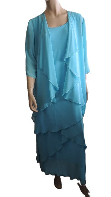 Gorgeous, flattering chiffon layered dress with a matching jacket. This longer length dress (lower calf) is perfect for the Mother of the Bride or Groom.