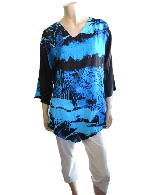 Cool and comfortable crinkle rayon top with a flattering V neckline and pointed hemline.