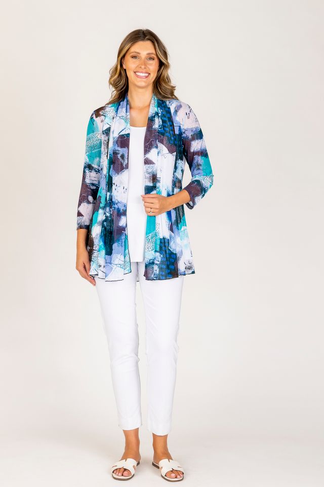 The open-front design with a softly flared hem is easy to wear and looks elegant while the striking abstract print creates a modern look. Featuring 3/4 length sleeves, this versatile piece is perfect for trans-seasonal dressing.