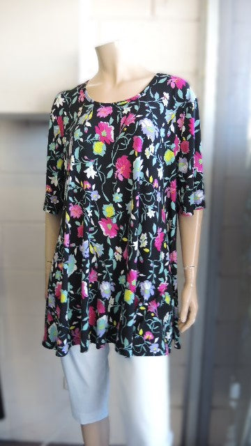 Flattering loose stretch poly/spandex top. This roomy top swings out across the hipline creating a slightly shaped style with plenty of room across the hips. Made in Australia by Shelz Plus Size Fashions.