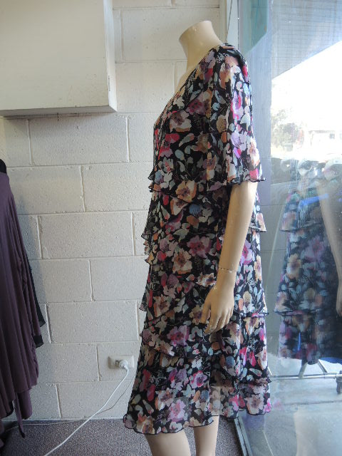We call this dress the WONDER DRESS as it is so flattering on anybody. The lining of this dress is a stretch poly/spandex and it has layers of angled chiffon over the top. Suitable for any elegant occasion.