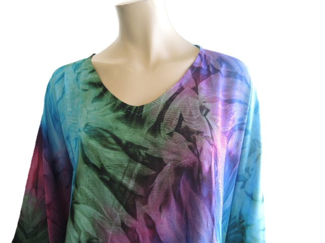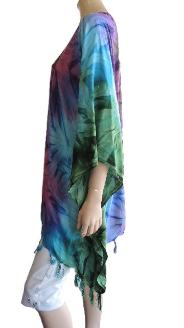 Cool and comfortable lightweight rayon kaftan style top with tassel trim on the hemline. Fits up to at least a size 28